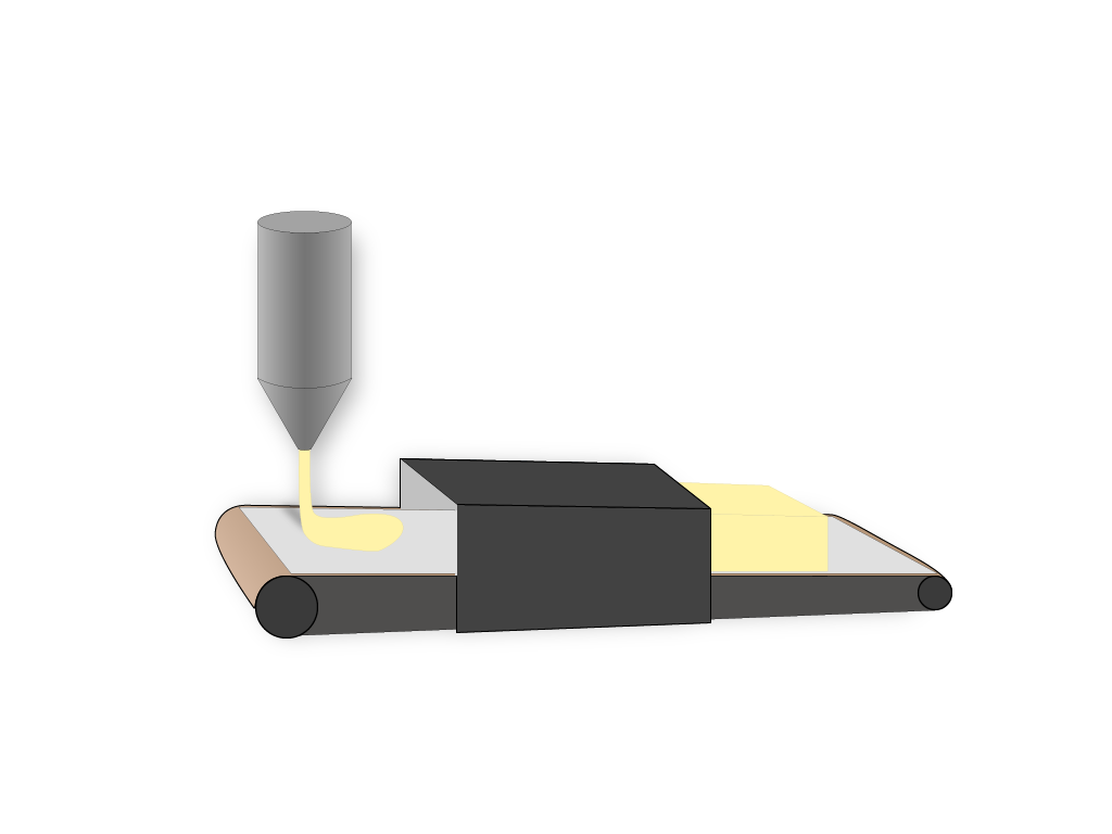Das Gemisch wird in ein formgebendes mit Papier ausgelegtes Fließband geben, durch die chemische Reaktion der Stoffe dehnt es sich aus und es entstehen PU-Weichschaumblöcke.